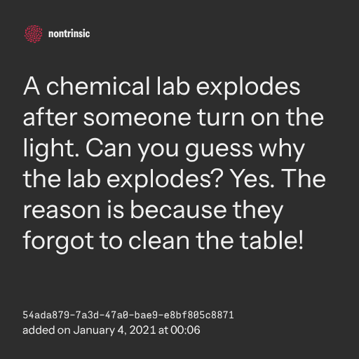 поделитьсяA chemical lab explodes after someone turn on the light. Can you guess why the lab explodes? Yes. The reason is because they forgot to clean the table!