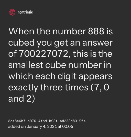 поделитьсяWhen the number 888 is cubed you get an answer of 700227072, this is the smallest cube number in which each digit appears exactly three times (7, 0 and 2)