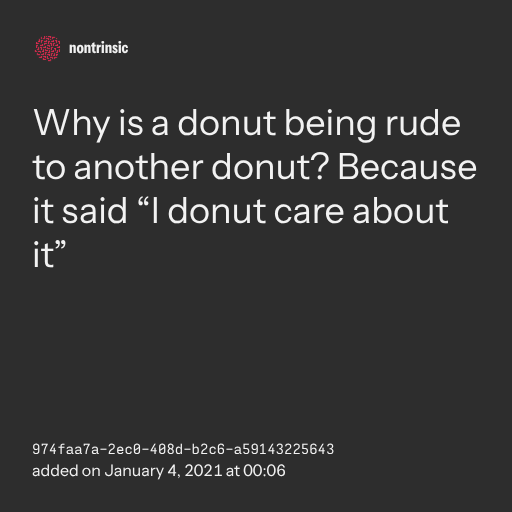 поделитьсяWhy is a donut being rude to another donut? Because it said “I donut care about it”