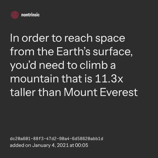 поделитьсяIn order to reach space from the Earth’s surface, you’d need to climb a mountain that is 11.3x taller than Mount Everest
