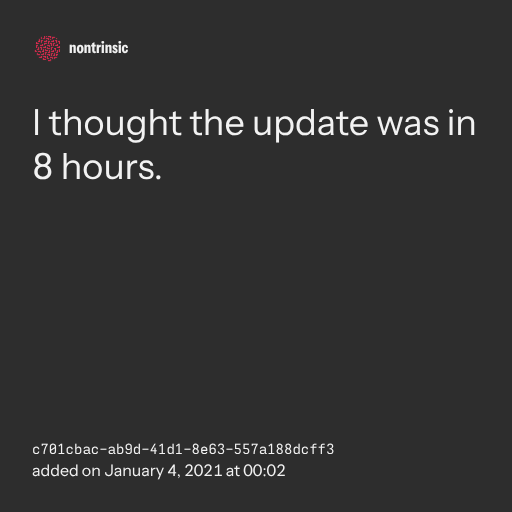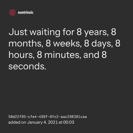 поделитьсяJust waiting for 8 years, 8 months, 8 weeks, 8 days, 8 hours, 8 minutes, and 8 seconds.