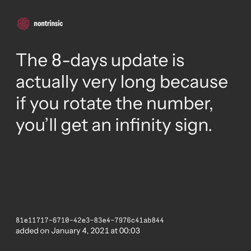 поделитьсяThe 8-days update is actually very long because if you rotate the number, you’ll get an infinity sign.