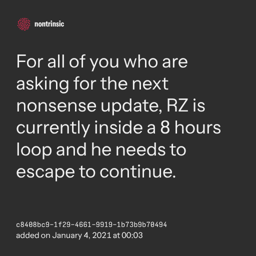 поделитьсяFor all of you who are asking for the next nonsense update, RZ is currently inside a 8 hours loop and he needs to escape to continue.