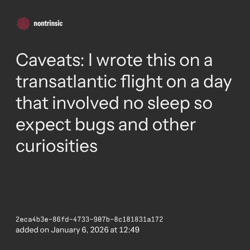 поделитьсяCaveats: I wrote this on a transatlantic flight on a day that involved no sleep so expect bugs and other curiosities