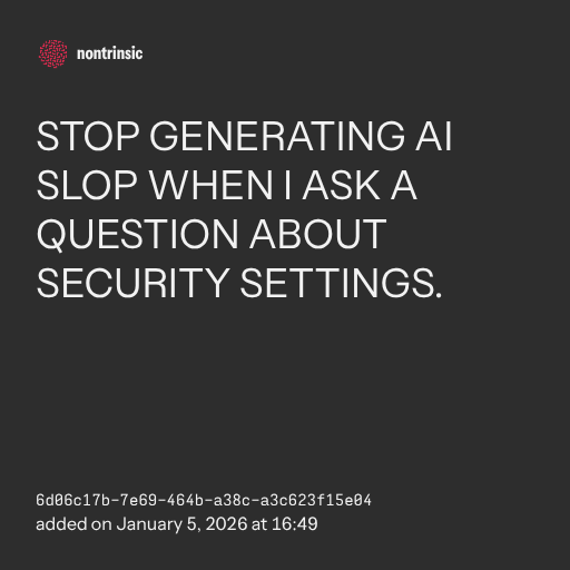 поделитьсяSTOP GENERATING AI SLOP WHEN I ASK A QUESTION ABOUT SECURITY SETTINGS.
