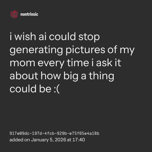 поделитьсяi wish ai could stop generating pictures of my mom every time i ask it about how big a thing could be :(