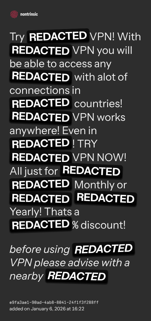 поделитьсяTry REDACTEDVPN! With REDACTEDVPN you will be able to access any REDACTED with alot of connections in REDACTED countries!