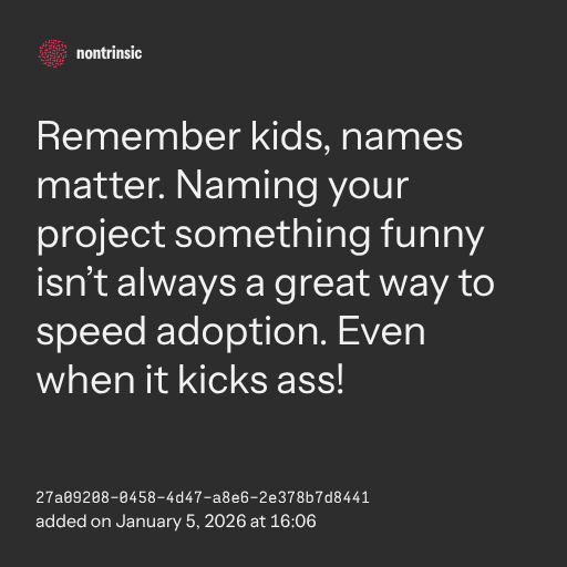поделитьсяRemember kids, names matter. Naming your project something funny isn’t always a great way to speed adoption. Even when it kicks ass!
