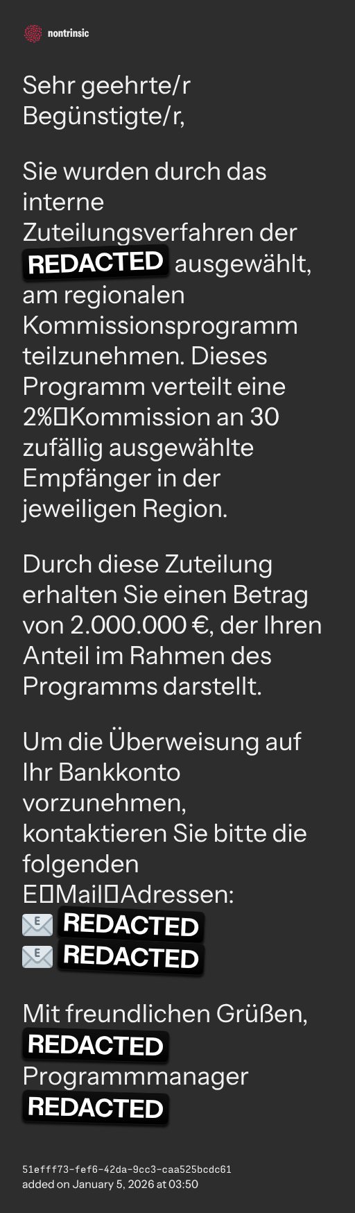 Sie wurden durch das interne Zuteilungsverfahren der REDACTED ausgewählt, am regionalen Kommissionsprogramm teilzunehmen. Dieses Programm verteilt eine 2%‑Kommission an 30 zufällig ausgewählte Empfänger in der jeweiligen Region.