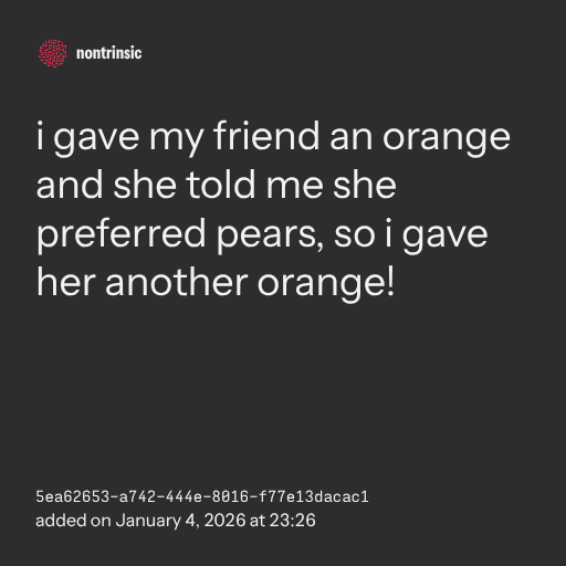 поделитьсяi gave my friend an orange and she told me she preferred pears, so i gave her another orange!