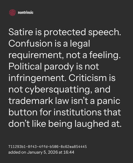 Satire is protected speech. Confusion is a legal requirement, not a feeling. Political parody is not infringement. Criticism is not cybersquatting, and trademark law isn’t a panic button for institutions that don’t like being laughed at.