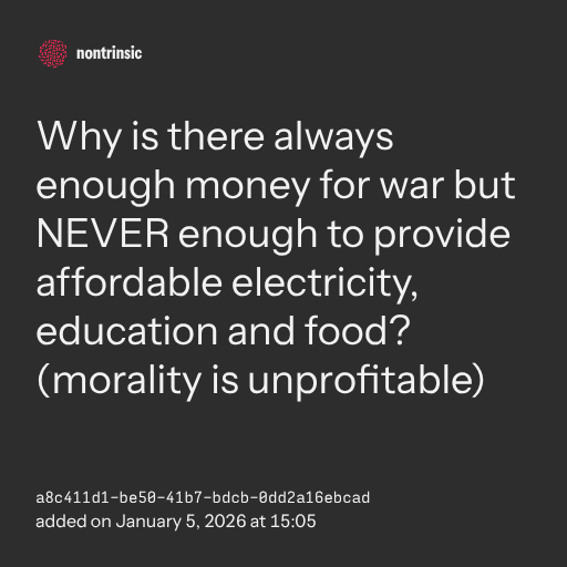 поделитьсяWhy is there always enough money for war but NEVER enough to provide affordable electricity, education and food? (morality is unprofitable)
